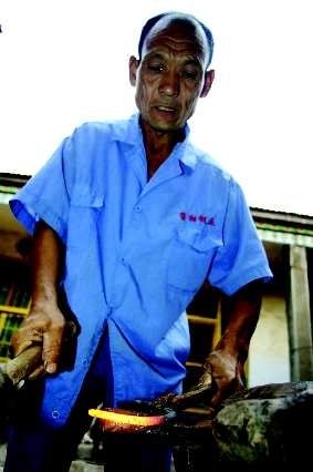 22日,记者来到王照开家,老王正抡着大锤打制马蹄铁。“从前生意大的时候,要雇人抡大锤,而今生意寥落,只好让老伴来打短工,夫妻俩就能忙活过来。”炉火旁,沉重的铁锤在老王手中起落间,火花四溅,清脆的锤打声如轻音乐般怀柔舒心。