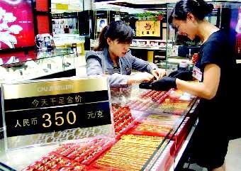 29日,在市区—家金店,市民在选购黄金饰品o近日,受国际金价持续走高的影响,临沂黄金饰品的价格也—路攀高,每克上涨10元左右,创历史新高o