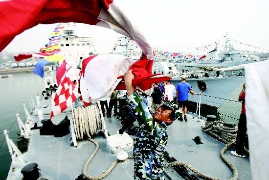 9月30日,在青岛海军博物馆,工作人员正在军舰上悬挂满旗。据了解,满旗是海军舰艇按规定悬挂国旗、军旗,并由舰艏通过桅杆连接到舰艉挂满通信旗的仪式,以庆祝重大节日。 本报记者杨宁摄影报道