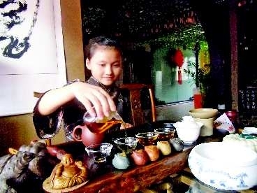 30日上午,记者在老县衙东侧三楼的“一味禅”茶艺馆看到,馆内工作人员正忙着洗涤茶具,擦洗玻璃窗。“一味禅”茶艺馆老板宋楠介绍说,针对国庆长假不少不喜欢热闹的市民的需求,他们专门推出“洗涤心灵”的休闲特价房间,房间布置以泰山文化和民俗特色为背景,房间内有棋牌、书籍、音乐可供选择,书籍以历史、佛经、修身养性的书籍为主,音乐有轻音乐、佛教音乐、古筝等十余种,市民也可自带音乐与书籍前来,房间内有专门的茶艺台,在这里市民可欣赏到最正宗的茶艺师的茶艺表演,并且市民也可一试身手。除此之外,一些茶艺馆还邀请一些心理咨询师、中医师和出家人,来为有特定要求的市民进行心理咨询、讲授养生秘诀和讲经等。