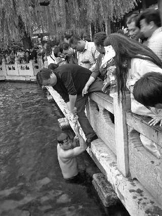 大约10分钟后,记者看到几名游客在石桥上向潭底焦急地张望,一名浑身湿透的中年男子说,“刚才我掉水里了,手机、身份证、房卡等物品都落到里面了。”中年男子表示,他姓许,来自河北保定,刚才从泉边经过时,和另一名不认识的游客一起被挤进了水中。上岸后,他因太冷着急回宾馆换衣服,便匆匆离开,“上了出租车才发现,兜里的物品都没了。”