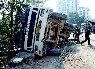 本报96706热线消息(记者 尉伟 实习生 牛耘)10月8日早上,郎茂山小区3号楼附近,市民张师傅正在路南买早点。突然他身后轰隆一声,路北一辆砼车翻倒在地,车头悬空,“枕”在七八米高的河岸上,右后轮则陷进了一窨井中。