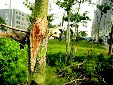 原本长势良好的雪松和白皮松,树干上大部分枝叶都被人砍去了,遗留着惨白的痕迹。8日上午,记者在祝舜路和东晨大街路口东南角的绿化带里发现这些“惨遭毒手”的树木。记者数了一下,有十多棵树木被人砍去了树枝。