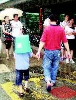 自述:天突然下起雨,小男孩把塑料桶套