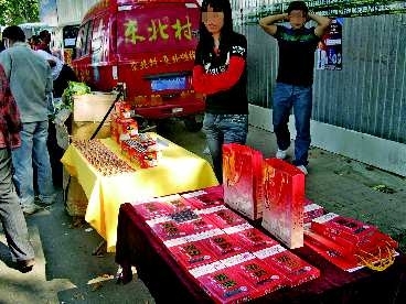 “样品茅台酒便宜了,50块钱一瓶”“30块钱买一只烤鸭赠三只烤鸡”……9日,经一路两侧吆喝声不断,低廉的价格也引来了不少市民购买,但是很多人买回家才发现上当了,高档白酒喝出了劣质白酒的味,烤鸭的肉也是臭了的。接到投诉后,工商部门称查扣了不少商品。图为经一路上借糖酒会摆开的摊子。