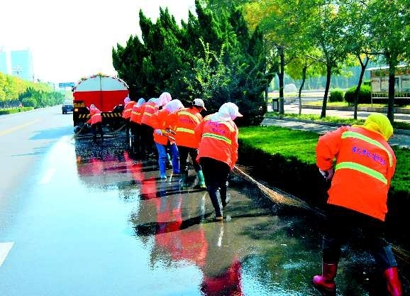 10月8日上午,府前大街出现—支由环卫工人组成的清洁大队,跟在洒水车之后清扫马路,形成—道舞动的风景。 本报见习记者 王斌 摄影报道