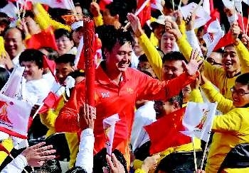 我国著名游泳运动员张琳手持胡锦涛主席授予的火炬,在圣火护卫人员陪同下,作为第一棒火炬手精神抖擞地跑出祈年门,开始了第16届亚运会火炬传递之旅。