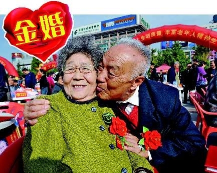 12日,李正老人亲吻相伴50年的老伴王显芳o当天,在泉城广场—百对相知相爱、相濡以沫的金婚老人,参加了由济南市老龄办举办的百对金婚模范老人庆典活动o这些老人是从济南范围内百对金婚模范老人评选活动中评出的,其中既有参加过济南战役的老战士,也有工人和农民o 本报记者 王媛 张中 摄
