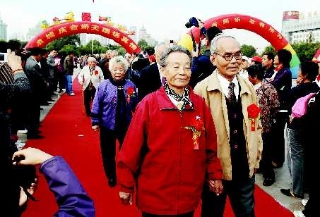 本报10月12日讯(记者 刘爽 通讯员 石紫)“结婚67年了,我们从没吵过架。战争年代相依为命,现在相互扶持。”12日上午,90岁的老太太于瑞芝扶着老公尹逊远的胳膊这样说。当日,济南市老龄委主办的百对金婚模范老人庆典活动在泉城广场举行,100对模范金婚夫妻向世人展示了他们相濡以沫的爱和亲情。