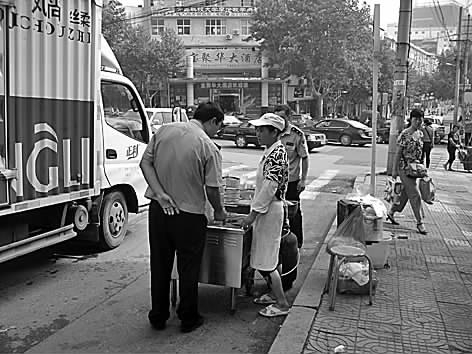 11日上午,在李沧区少山路的车行道上,一名摊贩正使用煤气罐摆摊卖早餐,受到城管中队执法人员处罚。 本报通讯员 王渊文 本报记者 赵郁 摄影报道