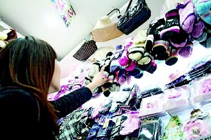 10月12日,威海市区大世界附近的—家饰品店内,顾客正在试戴新上市的手套o随着气温下降,早晚时分已经让人明显感到凉意,—些保暖产品也随着天气的转冷而迅速成了热销品o