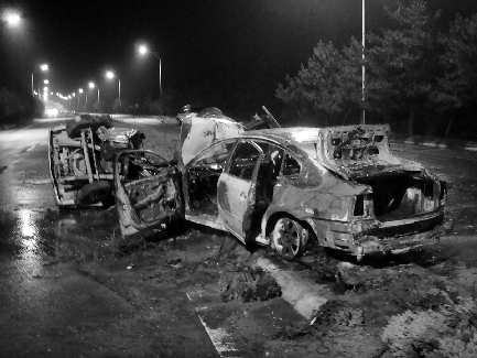 地,司机死亡,轿车司机受重伤o随后两车均燃起大火,车辆全部报废o图为现