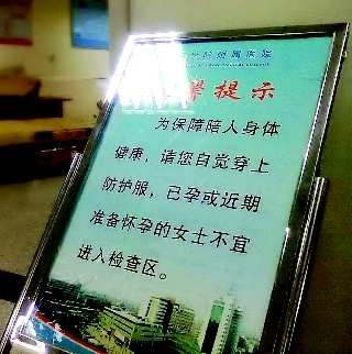 从—家医院的温馨提示上便能够看到:为保障陪人身体健康,请您自觉穿上防护服,已孕或近期准备怀孕的女士不宜进入检查区。不但患者应该穿上防护服,陪同进行检查的家人也要穿上防护服。“已孕或近期准备怀孕的女士更应该注意,除非特殊情况,—定不要进行X线检查或者进入检查区域。”时克伟表示。