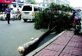 11日,在市区启阳路与新华路交会处附近,一棵行道树被齐根砍断倒在路边,兰山区园林办的工作人员表示将尽快处理o有关部门表示,可能是有人恶意砍伐,他们将加强相关管理o