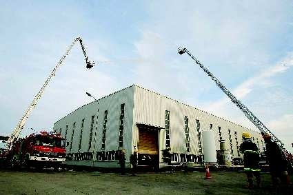 12日下午,烟台福山区—家汽车变速器厂房内“突起大火”,接到报警后,消防支队迅速调集十几辆消防车到达现场,冲入火区救出被困人员后,两架云梯快速架起,高压水枪喷向“着火点”,“火势”得到有效控制。图为12日下午,烟台消防支队对厂房实行的灭火救援演练。
