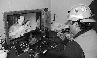 9月4日 智利矿业部发布的照片显示,一名救援人员与被困矿工进行首次视频对话。