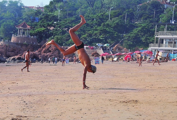 13日,在第一海水浴场,一位游客正在下水游泳前做运动。进入10月份,海水温度一般都在20摄氏度以下,不做足热身准备,极易发生腿抽筋,造成危险。浴场工作人员提醒市民在入浴之前,最好在浅水处横向游泳,在深水中游泳最好结伴前往。 本报记者 张晓鹏 摄影报道