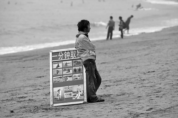 13日,在第一海水浴场,因为没有生意,一商贩只能靠在宣传板上休息。随着旅游旺季渐去,再加上连日来气温下降,来青游客减少,一些经营旅游商品的商贩生意惨淡,只能改行经营其他生意。