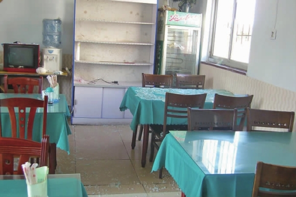 13日上午,记者在张村镇东夼村的这家饭馆看到,该饭馆靠路边的两扇窗和一扇门全被砸破,饭馆内的地面上散落着大量玻璃碴,靠近窗户的餐桌上更是布满碎玻璃。店主裴某说,这是被两名顾客砸的。