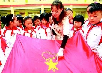13日,在临沂商城实验学校,老师正在为学生讲解少先队队旗知识o当日是中国少年先锋队建队61周年纪念日,该校开展了队旗下的宣誓、少先队队旗知识教育等活动o