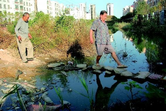 瑞康如意苑小区、金盾小区、红盾小区交界处有一条3米宽的污水沟。为方便行走,居民不得不用砖头、石块搭起了简陋的“桥”。