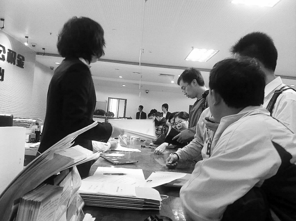 14日上午,威海市住房公积金管理中心内挤满了前来咨询或办理业务的市民。随着济南市上调公积金购房贷款首付比例,部分想用公积金办理购房贷款的市民也趁威海市还未出台相关政策抢搭末班车,享受公积金购房贷款首付20%的政策。本报记者 冯砚农 摄