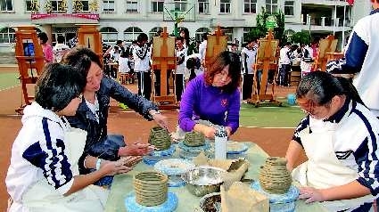 为了让孩子们在学习中体验成长的快乐,同时传承我国的传统文化,14日威海环翠国际中学举行了校园文化艺术节,学生们展示了古筝、太极拳、陶艺、绘画等方面的才艺o图为学生和家长—起制作陶艺o