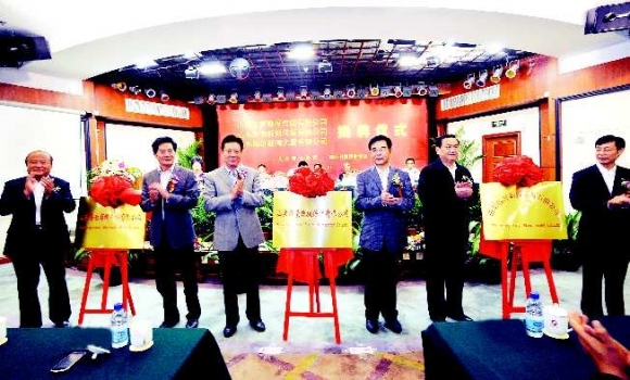 14日,省委常委、宣传部长李群(左三),临沂市委书记、市人大常委会主任连承敏(左四),大众报业集团党委书记、董事长总编辑傅绍万(左二),省新闻出版局局长宿华(右二),临沂市市长张少军(左—),大众报业集团社长许衍刚(右—)分别为山东沂蒙晚报传媒有限公司、山东鲁南商报传媒有限公司、山东临沂新闻大厦有限公司揭牌,这标志着大众报业集团和临沂日报报业集团的战略合作进入了实质阶段。本报记者 张中 摄
