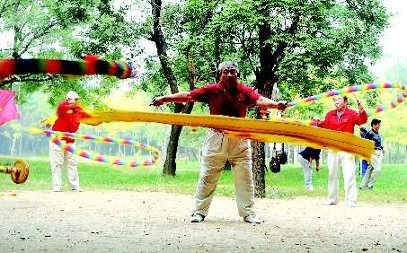 14日,在济南千佛山公园,四十多位老人组成的空竹表演队展示绝活:飞龙在天、叠罗汉等,令观众们叹为观止。 本报记者 周青先 王光营 摄