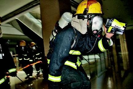 10月14日,德州市消防支队组织市区内3个消防中队、50余名消防官兵联合开展了大跨度、大空间建筑灭火救援实战演练,图为消防人员利用热像仪深入建筑内部寻找被困人员和着火源。
