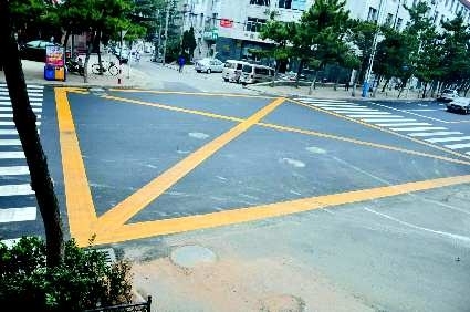 13日下午交通高峰时段,在环山路东段施划网状禁停区的路口(环山路与南山路交叉口)记者看到,很多车辆在遇有前方车辆堵塞时,并未在网状禁停区以外停车,而是全部进入禁停区内等待,直至这一路口无法容纳车辆,很快这个小路口南北通行的车流就被阻截无法通过o