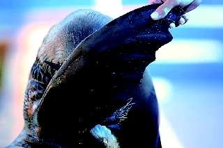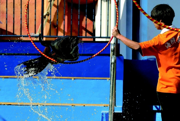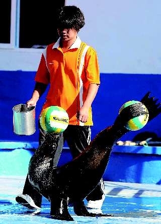 “乐乐”是烟台市南山公园海洋世界里的一只三岁大的海狮。