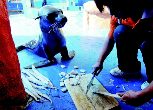据驯兽师王加辉介绍:“乐乐”一大爱好就是喜欢吃鱼,比如刀鱼、黄花鱼都是它喜欢吃的,而驯兽师也正是看准“乐乐”的这一“弱点”,一旦“乐乐”不刻苦训练和表演,就不给它好吃的,没办法,“乐乐”只好听驯兽师的话,看着驯兽师的手势训练和表演。时间长了,海狮“乐乐”就成了一个很受孩子们喜欢的偶像了。