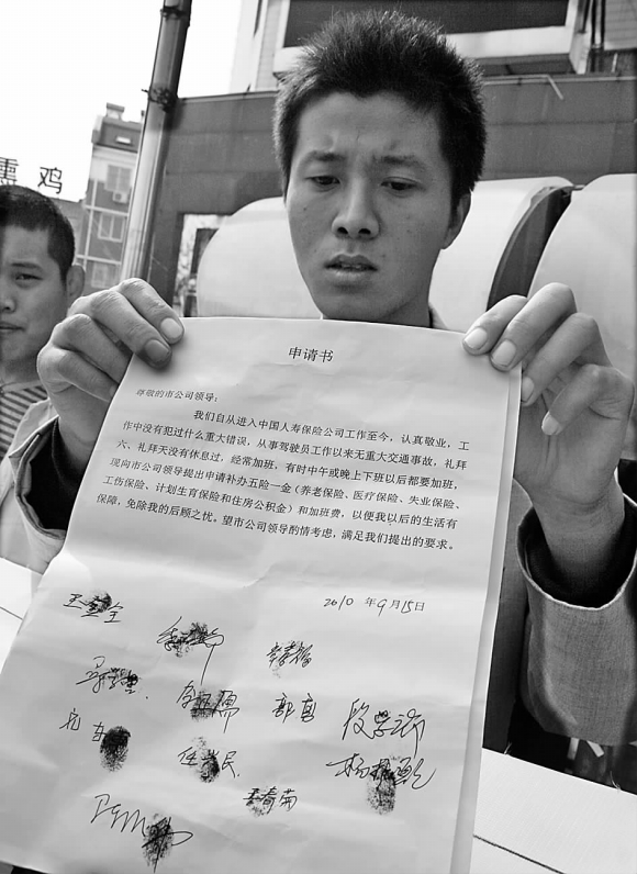 从2002年1月5日开始,王金全就在中国人寿聊城分公司办公室上班,2003至2007年,一直给该公司领导开车,2009年被分配到茌平公司。“工资从最初的440元涨到2009年的800元,后来被分到茌平公司后,又降到了600元”。王金全说,他上有老、下有小,靠这几百元钱,实在是没法过。更让他难以理解的是,“上班八九年了,医疗、养老、工伤等保险都没有,竟然连劳务合同都没签,一直到现在都没给解决。”