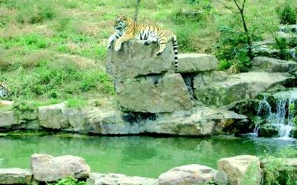 时间:2O1O年1O月2日。地点:扬州茱萸湾动物园虎园。自述:动物园里热闹非凡,大象们在表演顶球;金丝猴们忙着在树与树之间追逐打闹,只有虎园的大老虎们在泉水叮终的山头悠闲的横卧着,边欣赏山涧翠绿美景边慵懒的打着哈欠。点评:老虎也有打盹的时候。