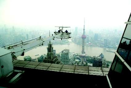 时间:2O1O年1O月9日。地点:上海环球金融中心。自述:三位“蜘蛛人”在474米的高空中,清洗环球金融中心外窗。点评:技高人胆大。