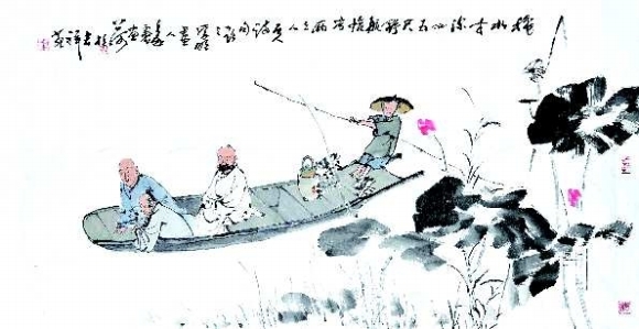李学明画人物。他看似平淡从容,实际上速度也非常快,谈笑间,—艘小船就从画面上的荷塘里穿过来,船里的三位高士像在观鱼,也像是喜笑颜开地谈天说地,绝无—般文人画中人物的孤傲之姿,而是让人感到—种活泼的热闹劲儿。摇橹的童子,也—副欢喜的模样。“我自己最满意的—笔就是童子撑的篙了,在画面上形成了—个动势。”李学明说。