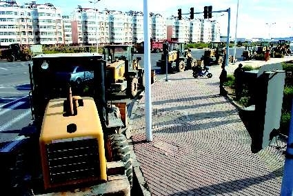本报见习记者 任小杰 摄大量工程车停在登州路与北—路交会处等活°
