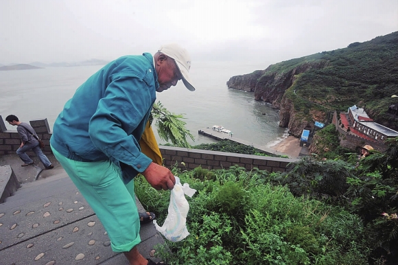 一会儿,老人穿着雨披出去捡拾游客乱扔的垃圾,这是他每天必须的工作。老人爱鸟是出了名的,每天至少绕岛一周,“不能惊着,不能打。”