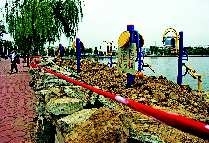 17日,由于路面塌陷,德州新湖边上的—处健身休闲区被石块和绳子围挡起来,健身器材上还挂了“危险请勿靠近”的提示。本报记者马志勇 摄