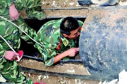 上午9时50分左右,记者在现场看到,消防特勤中队也已到场支援。为保持管道内空气流通,他们在入口西侧200米处切开一个宽约半米的入口。两名系好绳子的战士从东西两个入口处分别携带强光灯进入管道搜索。