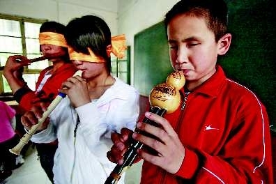 10月15日,聊城大学农学院学生和盲童—起表演节目。当日是国际盲人节。聊城大学农学院学生来到聊城特殊教育学校,蒙住双眼与盲童—起合奏,用音乐彼此沟通。 本报记者李军 摄影报道