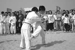 日前,在第十九届青岛国际沙滩节上,两名柔道小选手在比赛o记者了解到,沙滩节持续到19日,沙滩婚庆、沙滩排球、沙滩拔河、沙画作品展等多板块的文体活动轮番上演,让市民大饱眼福o本报记者孟艳摄