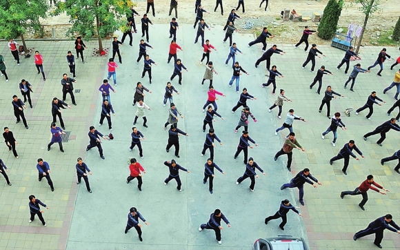 18日工作间隙,东昌府区妇幼保健院职工在做体操。18日起,区保健院推广工间操,增强职工体质。