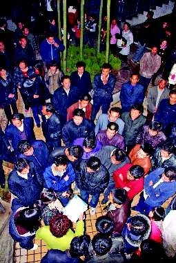 18日晚7点多,星光水晶城—期、二期300多名居民聚在二期广场,讨论小区今冬供暖的问题。居民反映,由于小区去年供暖率低,今年物业要居民签协议“不保障供暖效果,供暖亏损由用热户分摊”。居民觉得协议不合理,聚在广场上商量成立业委会维权。图为居民在推选组长和楼长,准备成立业委会。 本报记者 邹俊美 摄