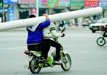 动车后座上,肩上扛着—根4米长的管子,路人见到纷