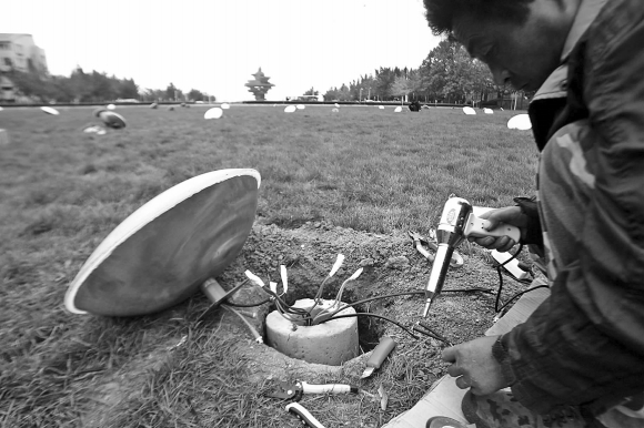 18日,在五四广场,工作人员正在安装七彩的LED草坪灯。据介绍,广场草坪将安装200多盏草坪灯,月底前就将完工。灯光通过电脑程序呈现出多种造型。