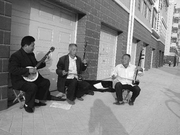 小区里统一安装了崭新的太阳能,清一色的六层楼,第一层是车库。顶层的设计是空中花园,不少村民在上面种上了南瓜或者丝瓜。在御苑小区里,张同厚、梁光钱、梁入道三位老人正坐在阳光下,用二胡和秦琴演奏着《毛主席的话儿记心间》。张同厚老人告诉记者,他们组织了一个器乐队,共有16位小区居民加入,每到下午他们就在小区里集体练习,现在已经会熟练演奏好几首曲子了。“其实我们农民也是有文化生活的,现在日子过得好了,我们也乐呵乐呵。”梁入道告诉记者。
