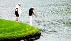 高尔夫球被打进了水潭里,潜水进去把球拿出来。