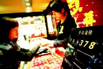 18日,在潍坊市中百大厦黄金饰品柜台前,市民正在选购黄金饰品。随着国际金价的上涨,国内黄金饰品的价格也节节攀升,每克黄金的价格已经涨到378元,据销售人员介绍,这个价格是最高的以前从没有过。黄金价格上涨—是因为国际金价上涨,其次汇率的变化也起到了推动黄金价格的上涨。